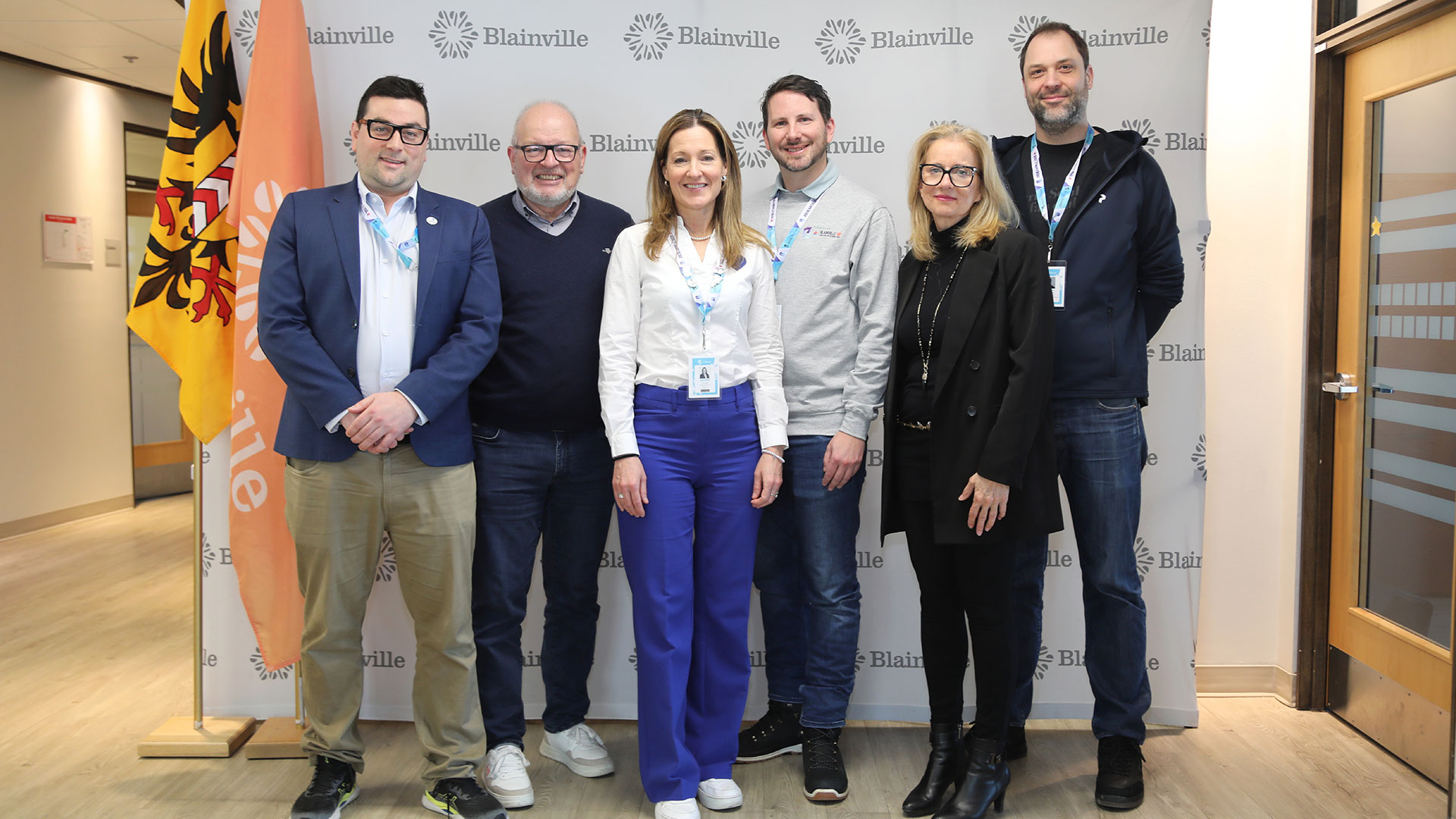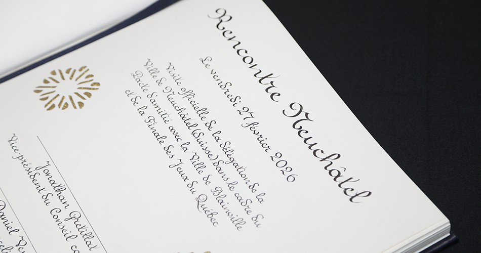 Dans le cadre du Pacte d’amitié signé avec la Ville de Neuchâtel en 2024, la Ville de Blainville a accueilli, pendant la 60e Finale des Jeux du Québec, une délégation composée de trois représentants de cette municipalité suisse : Jonathan Gretillat (vice‑président du conseil communal), Daniel Veuve (chancelier, équivalent du directeur général) et Damien Vaucher (chargé de projet aux relations extérieures – administration).