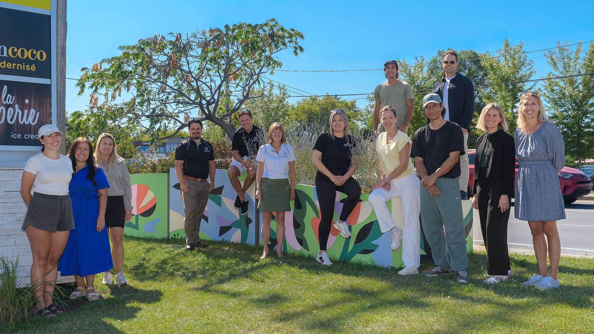 Sur la photo : (de gauche à droite) Camille Lebrun, assistante de Thaïla Khampo, Mélanie Lalancette, responsable liaison et projets collectifs de l’Aile Blainville (CCITB), Sonia Archambault, copropriétaire de l’Ami Sport et présidente de l’Aile Blainville (CCITB), Jean-François Pinard, conseiller municipal, Stéphane Bertrand, conseiller municipal, Nicole Ruel, conseillère municipale, Anick Pensato, propriétaire de Mille & Un Cupcake, Stéphane Norgn, assistant de Thaïla Khampo, Liza Poulin, mairesse de Blainville, Thaïla Khampo, illustrateur et muraliste, Jessy Turcot, directeur général de Turcot Olivier optométristes, Véronic Villeneuve, cheffe de division planification et règlementation et Catherine Fontaine, cheffe de division culture, évènements et logistique.