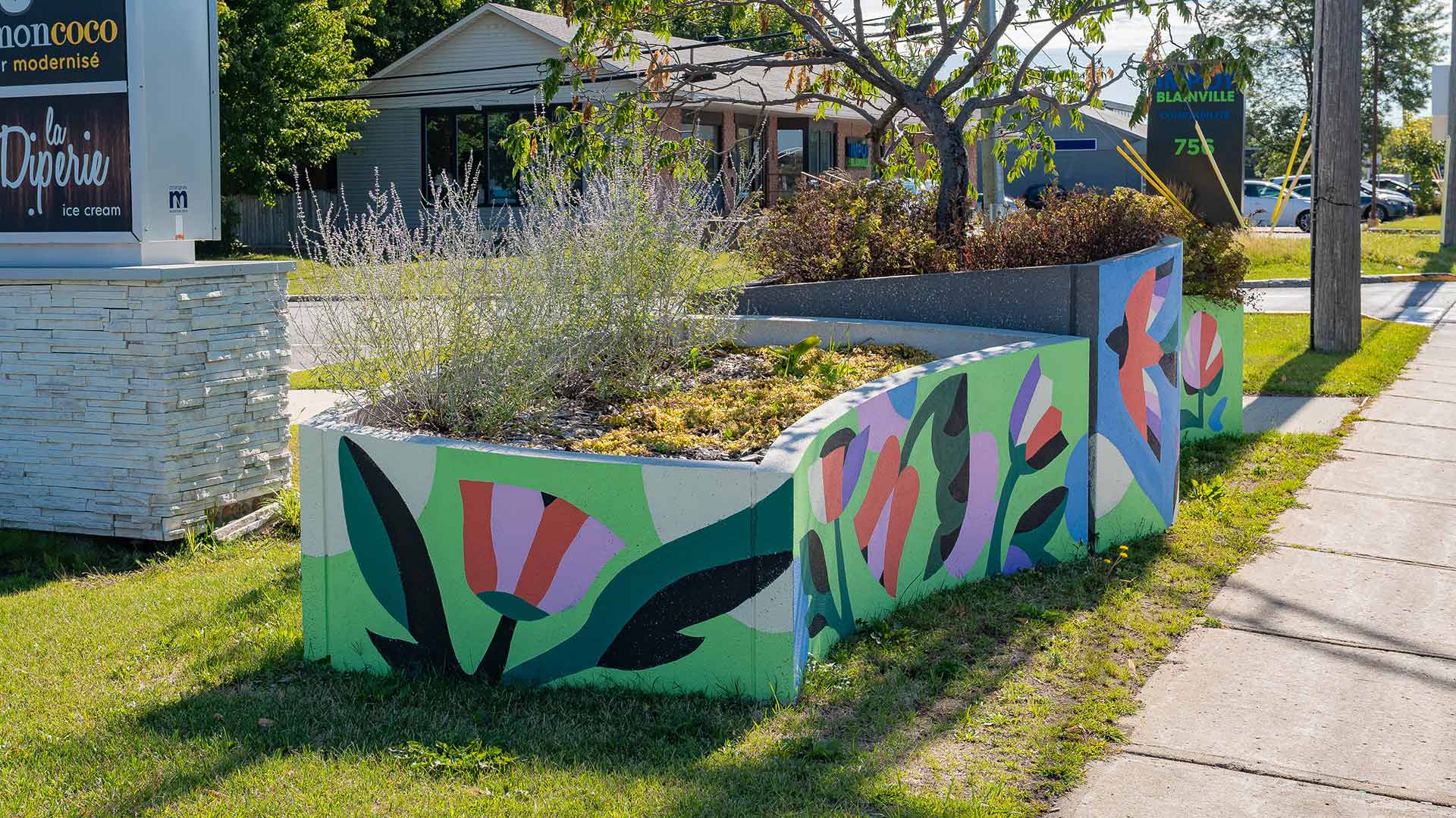 Grâce à la contribution de l’illustrateur et muraliste Thaïla Khampo, des bacs à fleurs en béton au sud du boulevard du Curé-Labelle ont désormais une nouvelle vie. Dans le cadre de la vision du réaménagement de cette artère principale et d’une entente de développement culturel entre le gouvernement du Québec et la Ville de Blainville, une trentaine de ces bacs ont subi une transformation artistique qui embellit le secteur et qui valorise les commerces avoisinants.